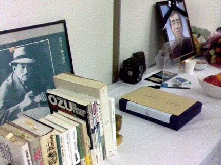 The memorial service was quite a surprise. Over 200 people crowded the small space on the sixth floor of the NFC, a testimony to how many people respected Tanaka-san's work. There was a small memorial table (photo below) with a photo (iei) of him, one of Ozu, a collection of his books, and some of the things he loved, including his camera. I did not know him as well as many others, so it was touching to listen to the tributes to this film scholar. A film was screened: a short indie work from 1990 called Isn't This a Lovely Day? (Sutekina hi ja nai ka?), in which Tanaka-san briefly appears as a school teacher. A memorial pamphlet and a CD of some of his lectures (including one on the film critic Kishi Matsuo) was distributed to those in attendance (one set of which will end up in the Yale ephemera collection). He never married, so his sister and her family gave an emotional thanks to everyone in attendance.